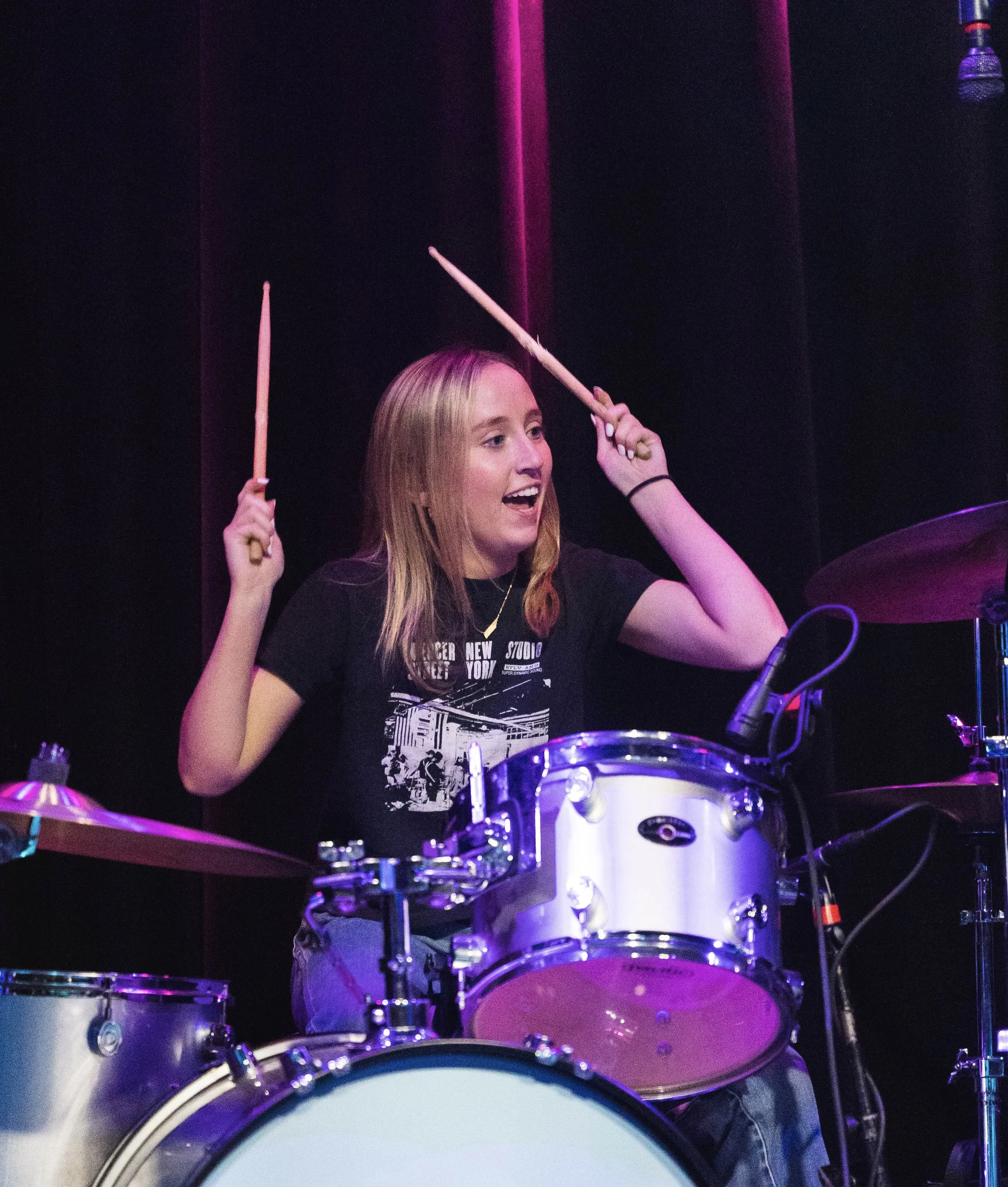 Her participation at School of Rock provided countless performance opportunities, which curated her love for live music and all genres. By learning long set lists full of tunes from Led Zeppelin, James Brown, No Doubt, and Paramore (just to name a few), she explored every facet of drum performance from a young age. In the 4th grade, her favorite bands were Steely Dan, Jethro Tull and One Direction. This attributes to her ability to channel a deep connection with any piece of music that she plays.
